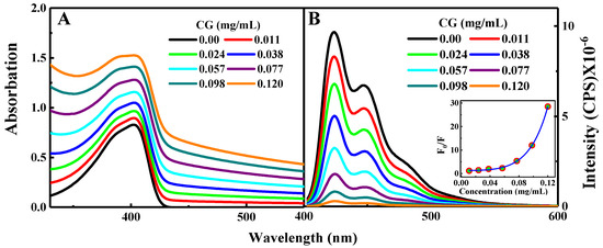 The absorption spectra of PFN alone and PFN with the successive addition of GC, in the absence of the GC, the absorption spectrum of PFN has a maximum peak at 402 nm with a shoulder at 383 nm and absorption cutoff at 450 nm [2,20,30]. Upon successive GC addition, the absorption spectrum of PFN is shifted upward with the GC concentration. This upward shift was demonstrated for the whole range of the recorded wavelength, and it was mainly originating from the absorption contribution of GC. The absorption and fluorescence of PFN with the successive addition of GC are shown in Figure 1A,B.