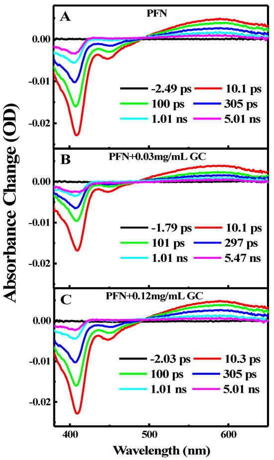Femto-nanosecond transient absorption spectra for (A) PFN alone, (B) FPN in the presence of 0.03 mg/mL GC, and (C) FPN in the presence of 0.12 mg/mL GC.