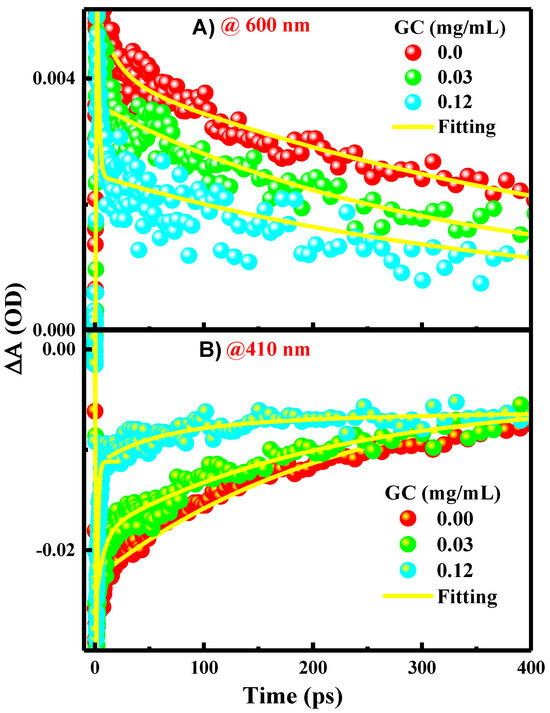 In the presence of 0.03 and 0.12 mg/mL of GC (Figure 4B,C), the transient spectral feature of the PFN–GC associations is basically similar to those of PFN alone. New absorption bands, which can be assigned to the existences of PFN+•–GC−• radical ion pairs, are not clearly observed. However, the results shown in Figure 4A,B for the kinetics of ESA at 600 nm and GSB at 410 nm for different GC concentrations reveal that the kinetics of GSB recovery and ESA decay are GC concentration-dependent.