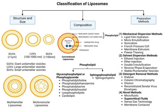 Classification of liposomes according to their structures, sizes, compositions, and preparation methods.