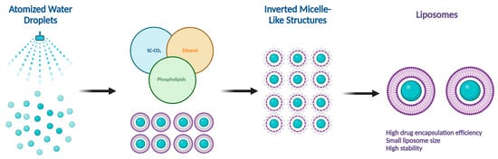 There are several methods for the preparation of liposomes (Figure 1) [2,9], such as thin-film hydration (or thin-layer evaporation), reverse-phase evaporation, double emulsification, ether injection, ethanol injection, and detergent removal. However, all these techniques are used for lab-scale production and mostly require the use of organic solvents in high concentrations and ratios. Moreover, they exhibit difficulty in controlling size and intercalation efficiency. Supercritical carbon dioxide (SC-CO2) (Figure 2) is a novel technique suitable for the large-scale production of liposomes with the advantages of high encapsulation efficiency and uniform particle size distribution without the necessity of post-formation processes such as sonication or extrusion [17,18]. In SC-CO2, CO2 is premixed with lipids and then enters a chamber with atomized water droplets. As a result of the high diffusion ability of CO2 and the reduced viscosity of the solution, lipids would coat water droplets at higher rates, resulting in inverted micelle-like structures, which are further stabilized by another layer of lipids placed at the bottom of the chamber [19].