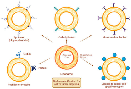 Site-specific drug delivery is a method of targeting drugs to specific sites in a manner that increases their therapeutic indexes and reduces their possible side effects and toxicities [22,24]. Liposomes can reach tumor sites passively through the EPR effect [23], while surface-modified (or surface-engineered) liposomes act by binding to specific receptors overexpressed by cancer cells, such as epidermal growth factor receptor (EGFR), folate receptor (FR), transferrin receptor (TFR), and other receptors (Figure 3) [22]. Since targeting the overexpressed surface receptors of cancer cells in order to enhance cellular uptake and intracellular activity is a promising approach, several cell surface strategies have been developed so far, aiming towards achieving the targeted inhibition of these receptors [22,24]. The efficiency of active targeting and ligand receptor interaction is dependent on certain factors [25], such as (1) the extent of receptor expression level on tumor cells relative to non-tumor cells, (2) the availability of surface receptors on tumor cells, (3) the internalization rate, and (4) the heterogeneity of receptor expression in tumor cells. Active targeting can be achieved through the surface engineering of liposomes via decoration with aptamers (oligonucleotides), carbohydrates, glycoproteins, monoclonal antibodies (mAbs) and their fragments, peptides, proteins, or other small molecules adsorbed onto the liposomal surface [22,24]. Figure 3 shows the surface modification of liposomes for active targeting. Figure 4 shows the distinction between passive and active targeting. Table 3 shows some examples of liposomes and their ligands used for active targeting.