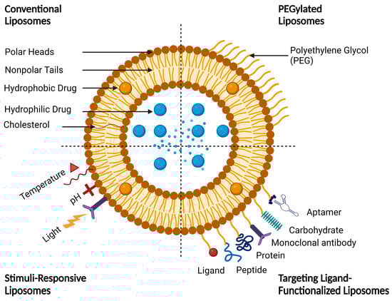 Functionalized liposomes include long-circulating PEGylated liposomes, targeting ligand-functionalized liposomes, and stimuli-responsive liposomes (Figure 5).