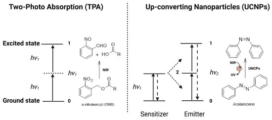 Light-triggered drug release from liposomes is mainly dependent on the penetration depth of the selected light source, the photophysical properties of the incorporated photo-responsive molecule, as well as the chemical composition and surface properties of the liposomal nanocarrier [115]. Several radiations have been used to trigger drug release, such as UV, visible, and NIR. However, the preferred wavelengths for therapeutic and biomedical applications are found in the NIR region (~700 to 1100 nm), since at these wavelengths, the light penetration depths are more than 1 cm [116]. The main mechanisms of drug release from NIR-responsive liposomes are photothermal effect, two-photon absorption (TPA), and up-converting nanoparticles (UCNPs) (Figure 10).