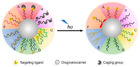 A schematic representation of the light-targeting mechanism through the activation of targeting ligands. A: Caging of the ligand binding sites; B: caging of the ligand electrical charge; C: anchoring of the ligands inside the nanocarrier system; D: neutralizing the ligand charge by electrostatic interactions; E: shielding of aptamer ligands through the use of complementary oligonucleotides; F: shielding of the ligands using thermo-responsive polymers. In all the aforementioned cases, the ligand is either caged or shielded in the nanocarrier system. Upon light irradiation, it is exposed to the surface of the nanocarrier system to allow for active targeting. Figure adapted with permission from [129].