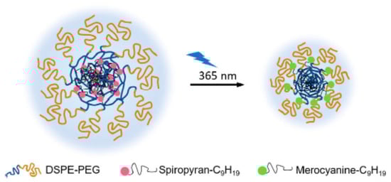 Nanocarrier size can influence tumor accumulation and penetration capacity in the tumor microenvironment. In general, nanocarriers with an average size below 100 nm are preferred to achieve deep tissue penetration, site-specific release, and targeted drug delivery [136]. Light can be used to reduce the particle size of nanocarriers, thereby enhancing tissue penetration and increasing tumor-targeting efficiency. For instance, Tong et al. [137] designed light-responsive nanohybrids made of PEGylated lipid and alkyl chain-conjugated spiropyran that were capable of shrinking upon UV irradiation and thereby achieved deep tissue penetration. Upon UV irradiation at 365 nm, the hydrophobic spiroyran transformed from the neutral spiroyran to the zwitterionic merocyanine, resulting in the nanohybrid inner cores’ structural rearrangement (Figure 12). The particle size reduction promoted the release of the encapsulated drug at its target site.