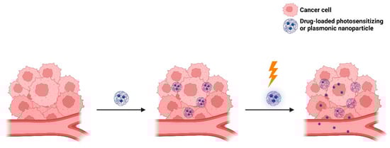 Light-targeting through blood vessel disruption improves EPR-mediated drug targeting to tumors [140]. This strategy comprises three main approaches: photodynamic therapy (PDT), photothermal therapy (PTT), and photoimmunotherapy (PIT). As mentioned earlier, PDT involves the use of dyes that are excited to a higher energy singlet state, from which they perform intersystem crossing to a triplet state that is suitable for energy transfer to molecular oxygen (3O2), forming singlet oxygen (1O2) or other reactive oxygen species (ROS) [141,142]. PDT can damage tumor endothelial cells, increase vascular permeability, and thereby improve the EPR effect and drug delivery to the tumor site [141,142]. In turn, PTT utilizes light to generate heat from plasmonic nanoparticles to kill the tumor cell (Figure 13). In the case of PIT, it utilizes antibody–photosensitizer conjugates that precisely bind to cells in the immediate perivascular space [143]. PIT can damage tumor cells through photosensitization, increase vascular permeability, and thereby improve drug delivery at the tumor site. For example, Sano et al. [144] developed panitumumab–photosensitizer conjugates. Upon IR irradiation at 690 nm, a high leakage rate of nanoconjugates (10–200 nm) into the A431 (human epidermoid carcinoma) cell line was observed clearly, indicating the potential of PIT to enhance nanodrug delivery in tumors.