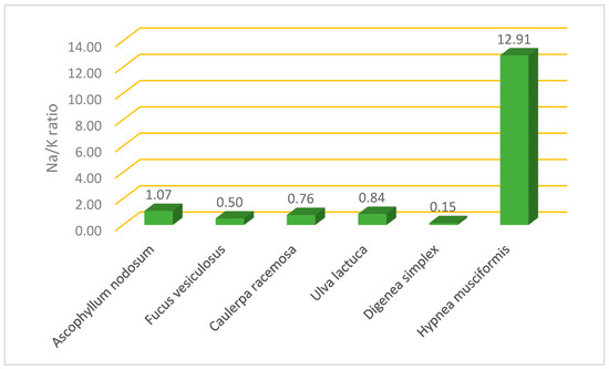 As shown in Figure 1, D. simplex had the lowest Na/K ratio (0.15), while H. musciformis presented the highest Na/K ratio (12.90).