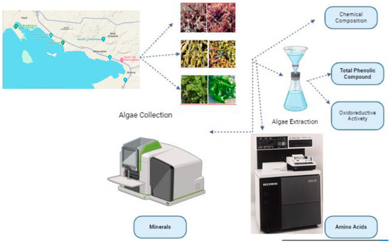 In recent years, the Red Sea has attracted attention due to its biological diversity and the abundance of algae biomass [1]. The type and distribution of the algae in the Red Sea are contingent upon various factors, including temperature and salinity changes, the depth zone, and the season [2,3]. Gomez-Zavaglia et al. [3] classified algae into microalgae and macroalgae. It should be noted that not all scientists agree on the division of algae, but the perspective is continually changing. One of the criteria for the classification of macroalgae is their pigmentation [4], which allows us to identify several large groups: red algae Rhodophyta (more than 6000 species), brown algae Phaeophyceae (more than 2000 species), and green algae chlorophyta (more than 1200 species).