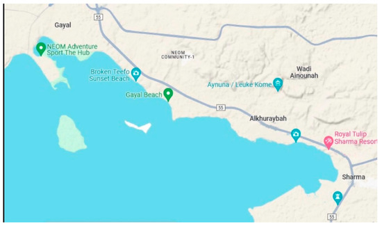 Selected coastal areas in the region of Tabuk (source: https://www.google.com/maps/@28.0766633,35.0502921,12z/data=!5m1!1e4?hl=en accessed on 22 January 2024).