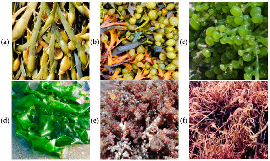 (a) Ascophyllum nodosum, (b) Fucus vesiculosu, (c) Caulerpa racemosa, (d) Ulva lactuca, (e) Digenea simplex, and (f) Hypnea musciformis.