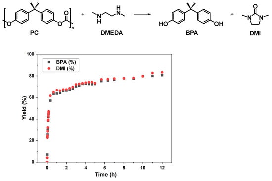 As shown in Figure 1, it was found that the depolymerization proceeded rapidly at the beginning, providing bisphenol A (BPA) and 1,3-dimethyl-2-imidazolidinone (DMI) in 73% and 74% yields, respectively, after 4 h. However, with the subsequent extension of the reaction time, the yields of degradation products hardly increased. The limit of yields could only be maintained at about 70–80%, suggesting that an equilibrium state had been reached. Upon analyzing the 1H NMR spectrum of the reaction at 24 h (Figure S1: 24 h, BPA 80%, DMI 82%), it was found that the remaining DMEDA was still present in the system, but it no longer underwent depolymerization with PC.