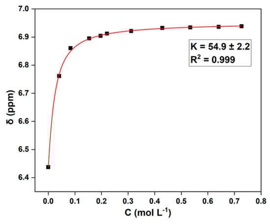 The unexpected phenomenon of PC being difficult to fully convert drove us to further investigate the underlying reasons. Compared to ethanolamine (amino alcohol), the depolymerization reagent DMEDA (diamine) showed a stronger basicity. From this feature, we deduced that the amino groups of the feedstock DMEDA may form strong hydrogen bonding with the phenolic hydroxyl groups of the product BPA, especially when a large amount of BPA is generated in the late stage of the reaction, thus hindering the smooth progress of depolymerization. To verify this hypothesis, the binding constant (K) between BPA and DMEDA through the O-H···N interaction was determined using concentration variation experiments with 1H NMR titration [,]. As shown in Figure 2, a high value of K was calculated as 54.9 ± 2.2, which was significantly greater than the O-H···O hydrogen-bonding constants (K = 0.9–10.9) reported for a series of hydroxylated biomass compounds [,]. This result indicated that there was a strong interaction between BPA and DMEDA. When they were tightly bound together, the amine group of DMEDA could not be exposed to attack the carbonyl group of the polymer chains, resulting in the PC material not being completely depolymerized.