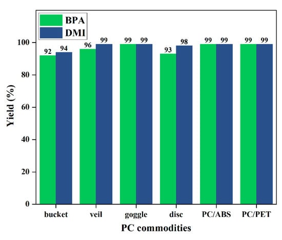 The PC commodities (pellet, bucket, veil, goggle, disc, tube), polyethylene terephthalate (PET) bottle materials, and AcrylonitrileButadieneStyrene copolymer (ABS) granular material were purchased on Taobao.com or Amazon.cn and used without further purification. N,N′-dimethyl-ethylenediamine (DMEDA) (98%, Macklin, Shanghai, China), 1,3-dimethyl-2-imidazolidinone (DMI) (>99%, Aladdin, Shanghai, China), and bisphenol A (99%, Macklin) were used without further purification. Dibromomethane (98%, Energy Chemical, Shanghai, China) and hexamethylbenzene (98%, Energy Chemical) were used as internal standards. Dichloromethane (DCM) (>99%), tetrahydrofuran (THF) (>99%), ethyl acetate (EtOAc) (>99%), toluene (Tol.) (>99%), and acetone (Ace.) (>99%) were purchased as solvents at Sinopharm Chemical Reagent Co. (Shanghai, China). Chloroform-d (>99%) was purchased at Cambridge Isotope Laboratories, Inc. (Tewksbury, MA, USA). Dimethyl sulfoxide-d6 (>99%) and benzene-d6 (>99%) were purchased at Energy Chemical. Chromatographic THF was purchased from Honeywell LTD (Tokyo, Japan) for the analysis of GPC measurements.