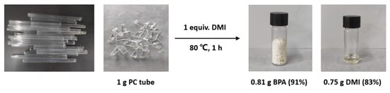 Similarly, for the depolymerization of PC material under the condition of 1 equiv. of DMI, an additional 216 µL DMI was required on the basis of the solvent-free reaction condition. Furthermore, when degradation experiments were carried out with 1 g of PC commercial tube material under this condition, it was observed that the fragments of PC tube disappeared after 1 h. The product was separated by silica gel column chromatography, the developing agent was an n-hexane and ethyl acetate system, the volume ratio was 50–1:1, and then the products were vacuum-dried and weighed. After that, the yield was calculated.
