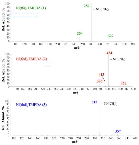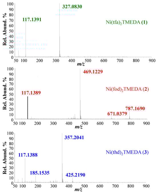 Ni(L)2TMEDA complexes (L = tfa, fod, thd) were synthesized following recently reported procedures, and their characterization by elemental analyses, IR, and various complementary techniques has already been reported [46]. Electrospray ionization high-resolution mass spectrometric (ESI-HRMS) data were acquired by a Q Exactive™ hybrid quadrupole-Orbitrap™ mass spectrometer (ThermoFisher Scientific, Waltham, MA, USA) in positive ion mode (resolution = 70,000; sheath gas N2 at 10 psi; spray voltage = 3.5 kV; and capillary temperature 280 °C). Orbitrap MS calibration was performed using a standard ThermoFisher Scientific Pierce® ESI positive-ion calibration solution. Low-resolution electrospray ionization mass spectrometry (ESI-MS) analyses were performed using a LCQFleet ion trap instrument (ThermoFisher Scientific), operating in positive ion mode. The spray voltage and capillary temperature were 4.0 kV and 250 °C, respectively. In both cases, 10−6 M solutions of the target compounds were introduced by direct infusion using a syringe pump (flow rate = 10 μL × min−1). MSn experiments were performed by applying a supplementary radio frequency (RF) voltage to the end caps of the ion trap (5 V peak-to-peak).