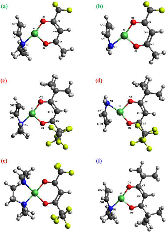 Optimized structures of: (a) [Ni(tfa)TMEDA]+-NH(CH3)2; (b) [Ni(tfa)TMEDA]+-CH3CH2N(CH3)2; (c) [Ni(fod)TMEDA]+-NH(CH3)2; (d) [Ni(fod)TMEDA]+-CH3CH2N(CH3)2; (e) [Ni(fod)TMEDA]+-(CH3)2C=CH2, due to an additional fod ligand rearrangement; (f) [Ni(thd)TMEDA]+-NH(CH3)2. Color codes as in Figure 3.