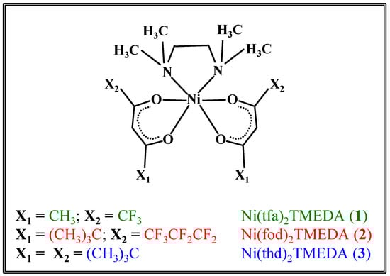 In this context, metal β-diketonate complexes are among the most widely used precursors for the CVD of metal oxide films and nanomaterials [33,34]. They present significant flexibility for the modification of their chemico-physical properties by varying the steric hindrance, features, and dimensions of the ligand backbone [33]. Nevertheless, as regards the CVD of NiO, the conventional [Ni(acac)2] [22,35] and [Ni(thd)2] [36,37] (Hacac = 2,4-pentanedione; Hthd = 2,2,6,6-tetramethyl-3,5-heptanedionate) suffer from concurrent problems, including their high melting points and limited gas phase stability [33,35,38,39,40], that hinder the achievement of a precise process control and prevent their straightforward large-scale use.