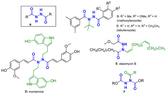 N,N′-Diacylhydrazines (DACHZs, general structure A, Figure 1) represent an interesting class of compounds with potential applications in chemistry and biology. Several N-tert-butyl-substituted derivatives, such as methoxyfenozide and tebufenozide (B and C, respectively, Figure 1), are well known for their insecticidal activity. Due to their ability to mimic the action of two principal hormones in insects while having almost no impact on most non-target and beneficiary organisms, those derivatives have been subjected to numerous structural modifications [1,2,3,4]. Moreover, an N,N′-bis substituted DACHZ moiety is found in the naturally occurring alkaloids montamine (D) that displays anti-oxidative activity and cytotoxicity against CaCo-2 colon cancer (IC50 = 43.9 μΜ) and elaiοmycin (E) that displays strong in vitro inhibition against bovine and human strains of Mycobacterium tuberculosis [3,5]. A similar urethan-like pattern (general structure F) is considered as a useful synthon in Organic Chemistry [6].