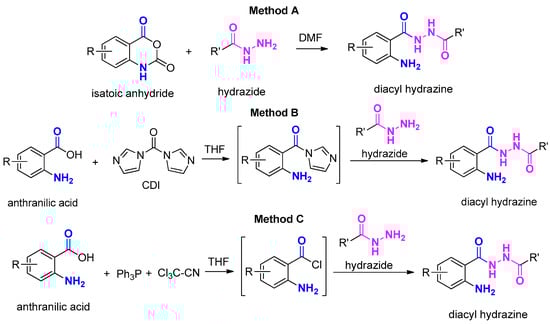 There are several methods in the literature to form amide bonds using a carboxylic acid and an amine [59,60,61] which apply to the synthesis of hydrazides as well [33,62,63,64]. More specifically, the synthesis of anthranilamides is performed upon activation of the carboxylic acid with known classic reagents or with the use of isatoic anhydrides. In our case, depending of the availability of the reagents, we have used the nucleophilic attack of the proper hydrazide to (a) isatoic anhydride [20] (Figure 3, Method A), (b) the intermediate imidazole amides derived from AAs using Ν,Ν’-carbonyldiimidazole (CDI) as the coupling agent [65] and adopting a modified methodology for AAs [66] (Figure 3, Method B) and finally (c) the in situ formation of anthraniloyl chlorides upon treatment with Ph3P and CCl3CN anthraniloyl chlorides (Figure 3, Method C). The latter has been established for the synthesis of carboxylic acid amides, where triaryl phosphonium chloride is believed to be generated upon the reaction of Ph3P and CCl3CN. This reacts further with carboxylic acid to produce the corresponding acid chloride, triphenylphosphine oxide and dichloroacetonitrile [67].