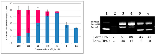 Diagram on the (left): Plots of DNA photocleavage of the compound 9 under various concentrations (indicated at horizontal axis): Error bars represent the standard deviation from at least two experiments; blue column: % ss cleavage; red column: % ds cleavage (for all gel pictures see Supplementary Materials S.3). Picture on the (right): DNA agarose gel picture (one experiment) for the compound 9 under 312 nm irradiation for 30 min, at concentrations of 100, 50, 10, 1, 0.5 μM, Lanes 2–6, respectively (Supplementary Materials S.3.2). Lane 1: control (DNA + UV). Calculations of Form II and Form III % are shown below the picture, compared to the control.