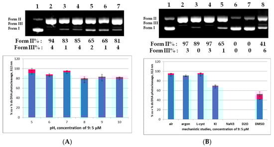 (A): (Top) picture: DNA agarose gel picture (one experiment) for the compound 9, 312 nm, 30 min, at a concentration of 5 μM and pH 5–10. Lane 1: Control DNA at pH 7; Lanes 2–7: pH 5–10, respectively. Calculations of Form II and Form III % are shown below the picture, compared to the control. (Bottom) diagram: Plots of DNA photocleavage of the compound 9 of all experiments at pHs shown on the horizontal axis; Error bars represent the standard deviation from at least two experiments; blue column: % ss cleavage; red column: % ds cleavage, (Supplementary Materials S.3.3); (B): (Top) picture: DNA agarose gel picture (one experiment) for the compound 9, 312 nm, 30 min, at concentration of 5 μM. Mechanistic studies: Lane 1: control, Lanes 2 and 3: under air and under argon; Lanes 4–8: under air and various scavengers like: L-cyst, KI, NaN3, D2O and DMSO, respectively. (Bottom) diagram: Plots of DNA photocleavage of the compound 9 of all mechanistic experiments shown on the horizontal axis. Blue and red columns as in (A) (Supplementary Materials S.3.4).