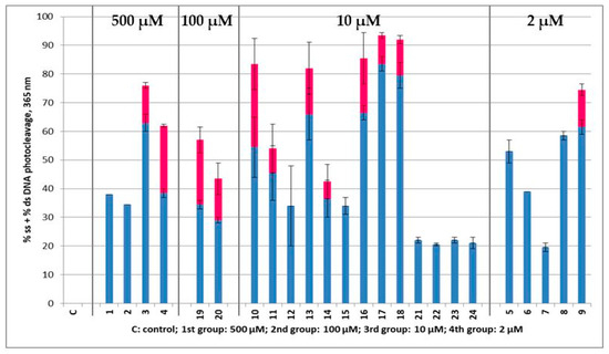 Plots of DNA photocleavage of the compounds 1–24 under various concentrations, at 365 nm. C: control; 1st group of four compounds separated with gray lines are compounds that gave DNA photocleavage at a 500 μΜ concentration; 2nd group—two compounds: 100 μΜ concentration; 3rd group—thirteen compounds: 10 μΜ concentration; 4th group—five compounds: 2 μΜ concentration. Error bars represent the standard deviation from at least two experiments; blue column: % ss cleavage; red column: % ds cleavage (all gel agarose pictures at Supplementary Materials S.5).