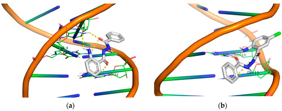 Finally, all the –NO2 derivatives (21–24) utilized the -NH2 and –C=O groups to form hydrogen bonds with the DNA bases. Even though the -NO2 group does not participate in this network of polar contacts (with the compound 24 being the only exception), the binding of these compounds to DNA is significantly strong. Although all nitro derivatives proved to be ineffective under UV-B light, in the UV-A area they demonstrate a moderate photocleavage ability, fragmenting DNA at a concentration of 100 μM. In Figure 9, Figure 10, Figure 11 and Figure 12 images of all phenyl substituted AA DACHZ compounds 1, 5, 9, 13, 17, 19, 21 and 23 are shown (Supplementary Materials S.7).