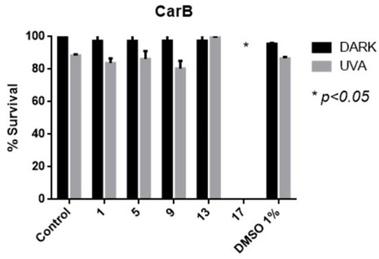 The highly malignant melanoma cell line CarB were used for cell culture experiments. These cells derive from squamous cell carcinoma of the mouse skin. Generally, skin cancer is preferred in drug photoactivation studies due to the penetration of UV radiation [70]. Moreover, our aim was to test the compounds activity on highly aggressive and metastatic cells. The cells were incubated with 100 μM of each selected compound 1, 5, 9, 13 and 17 and were irradiated at 365 nm (broad band) for 1 h. The selection was based on DNA photocleavage experiments where all compounds 5, 9 and 13, 17 were found active at 2 and 10 μM, respectively (Figure 8, Supplementary Materials S.5). Derivative 1 was selected for comparison, since it bears the same (phenyl) group attached on the diacylhydrazine moiety. It was observed that 17 possesses a high cytotoxic role; however, this role is not specific after UV irradiation. Among the compounds 1, 5, 9 and 13, it seems that 9 has a slight phototoxicity; nevertheless, this toxicity is not that impressive at 100 μM (Figure 14).