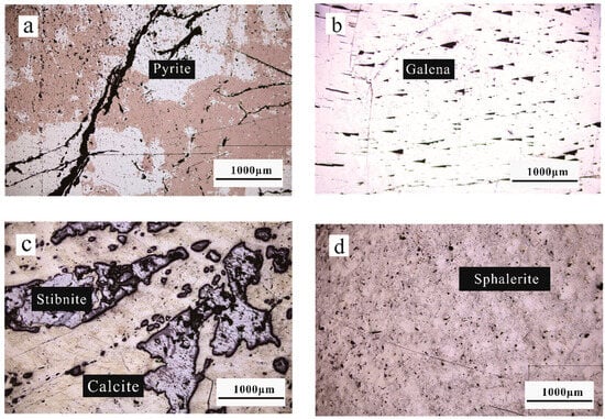 Pyrite, Galena, Stibnite, and Sphalerite are observed under a microscope (Figure 1). Pyrite (Figure 1a) appears yellowish-white under the microscope, with a pockmarked surface, and is a high-hardness mineral because the sulfide is very easy to oxidize; the reddish-brown part is an oxidized film, and it is black because of the low reflectivity of the cleavage. Galena (Figure 1b) is pure white under the microscope, with triangular traps and abrasions on the surface of the mineral, which is a mineral with low hardness. Stibnite (Figure 1c) is gray under the microscope, is an aggregate of elongated bars and grains, with scuff marks seen on the surface, and is a low-hardness mineral. Yellowish-white minerals are nonmetallic calcite, and blackish are Stibnite de-surfaced traps. Sphalerite (Figure 1d) is gray under the microscope, a rare autocrystalline, medium-hardness mineral.