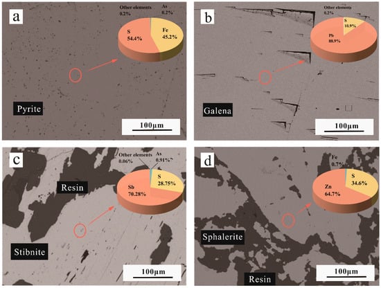 Microscopic characterization of pyrite (a), galena (b), stibnite (c), and sphalerite (d) results.