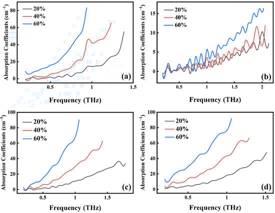 This study uses THz-TDS to analyze different concentrations of Stibnite, Sphalerite, Galena, and Pyrite The absorption coefficient curves of Stibnite (Figure 3a), Galena (Figure 3c) and Pyrite (Figure 3d) at a 60% concentration exhibit significantly higher values compared to those at a 20% concentration within the 0.2–1.5 THz range. The average absorption coefficient values for Stibnite, Galena, and Pyrite at a 60% concentration are determined to be 25.88, 31.28, and 43.84, respectively, while those at a 20% concentration are 10.49, 13.16, and 16.16, respectively. This observation demonstrates that the absorption coefficients increase with the increase in mineral concentration, aligning with Beer–Lambert law [32].