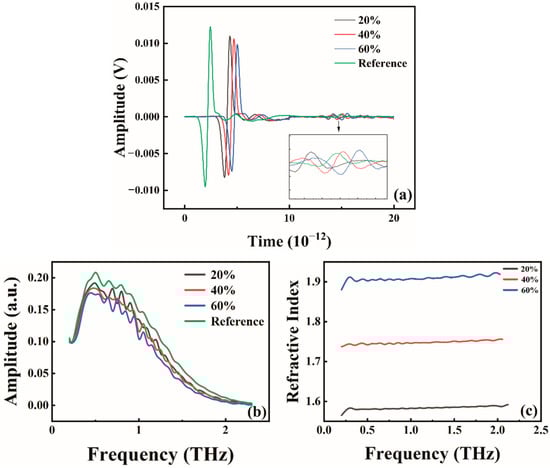 However, the absorption coefficient curves of Sphalerite (Figure 4b) exhibit irregular fluctuations, illustrated in Figure 4a. The time-domain signals of the three samples (20%, 40%, and 60%) contain echo signals, and their unprocessed amplitude curves obtained directly by Fourier transform (Figure 4b) also display irregular fluctuations. Consequently, the absorption coefficient plots (Figure 3b) and the refractive index plots (Figure 4c), obtained through calculation, exhibit more pronounced irregular fluctuations. Moreover, the average values of the absorption coefficients for concentrations of 80%, 60%, and 20% are 5.99, 3.49, and 3.07, respectively, indicating that they still adhere to the principle that increasing concentration enhances the absorption coefficients. However, due to the uncertainty associated with the optical frequency at low and high frequencies, the concentration size for the remaining groups of samples is ultimately determined to be 40%.