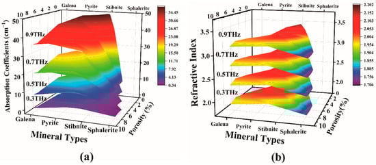 By analyzing the slow slope take, 0.3, 0.5, 0.7, and 0.9 THz are chosen as the absorption coefficient values at the projection point. Figure 5a comprises absorption coefficients, sample porosity, and species. At a frequency of 0.3 THz, the absorption coefficient of Galena, Pyrite, Stibnite, and Sphalerite remain in the range of 0.99–2.49, 4.04–6.43, 0.88–1.35, 0–0.36, respectively, as the porosity increases. Similarly, conducted within a limited range, the analysis focused on absorption coefficient values for minerals at 0.5, 0.7 and 0.9 THz. As depicted in Figure 5, the absorption coefficient values of minerals exhibit a consistent pattern, maintaining relative constancy across the spectrum from low to high porosity. As the frequency rises, the mapping surface colors of Galena and Pyrite shift from blue to red, and Stibnite transitions from blue to green. This change signifies a gradual increase in their absorption coefficient values. In the case of Sphalerite, the color remains predominantly bluish-purple, with a minor increment in absorption coefficients.
