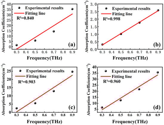 The overall adsorption rate demonstrates improvement with an increase in sample frequency. Negative absorption coefficients in Sphalerite can be attributed to the introduction of noise during its measurement using THz-TDS. Additionally, the absorption rate of Stibnite is the highest, while Sphalerite is significantly lower than the other three minerals. When the porosity ranges from 5–8%, the maximum value of Sphalerite absorption coefficients does not exceed 5 cm−1, as analyzed in Figure 4. Sphalerite’s mineral properties, composition, and content contribute to this behavior. Consequently, terahertz creates favorable conditions for qualitative and quantitative detection of substances.