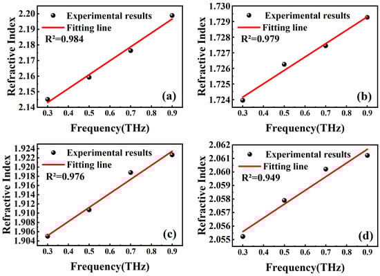 Frequency-refractive index fits for 1.95% porosity stibnite (a), 7.8% sphalerite (b), 8.9% galena (c), and 4.2% pyrite (d).