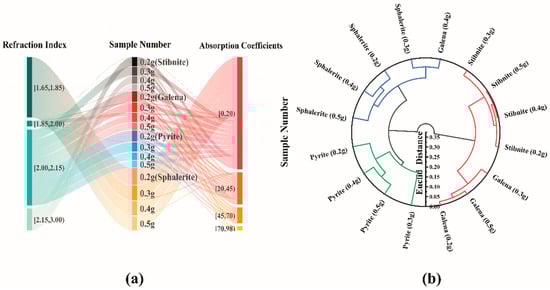 Sankey plots of absorption coefficients and refractive indices for different masses of stibnite, galena, pyrite, and sphalerite (a) and circular clustering plots based on refractive index spectra in the 0.1–1.5 THz band (b).