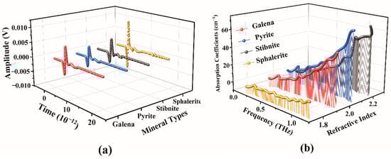 Time-domain amplitude plots (a) and absorption coefficients-refractive index plots (b) for galena, pyrite, stibnite, and sphalerite.