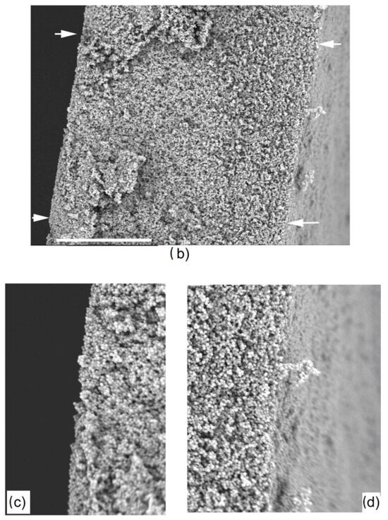 To understand how this procedure affects the PG structure, we conducted SEM analysis, acquiring images simultaneously with both back-scattered and secondary electron detectors in mixed mode. A fragment of the sample was detached from the glass substrate, placed vertically on a cross-section sample holder, and fixed with carbon tape.