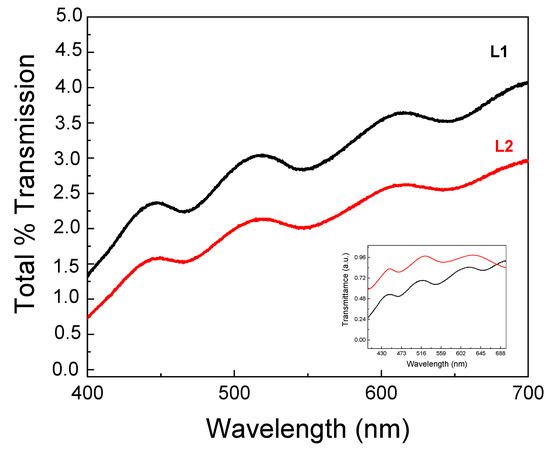 Figure 3 shows the transmittance spectra of L1 and L2, where it is possible to observe the presence of oscillations in the spectra associated with the existence of modes for the electromagnetic field in the spheres (Mie resonances). The wavelength position of these resonances depends on the sphere diameter (d) and the refractive index (n) of the material.