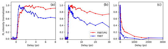 Time-dependent PL signal at 545 nm (region of integration 535 nm–555 nm) obtained from fluorescence upconversion measurements in F8BT (blue line) and F8BT/PG (red line). Different temporal windows are shown: up to 8 ps (a), up to 30 ps (b), and up to 3 ns (c).