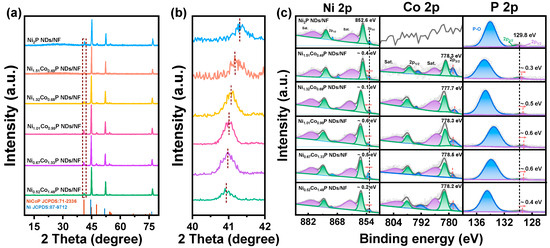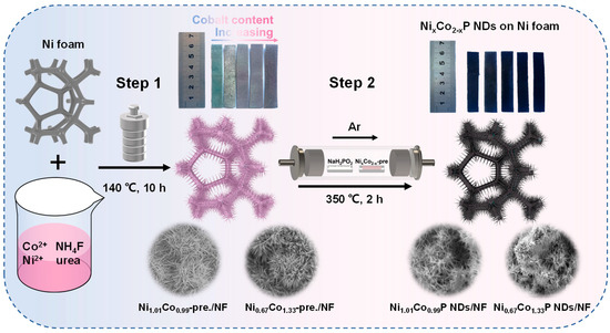 2.1. Preparation and Structure Characterization of NixCo2−xP NDs/NF