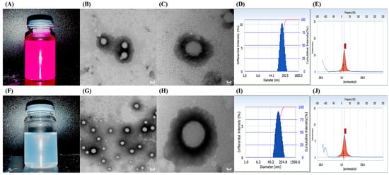 Appearance (A,F); transmission electron microscopy ((B,G) 2 × 104, (C,H) 5 × 104); size distribution (D,I); and zeta potential (E,J) results of Rh-B-(2-HP-β-CD)/PLGA NPs (A–E) and TA-(2-HP-β-CD)/PLGA NPs (F–J).