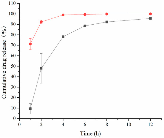 Figure 2 shows that the cumulative release rate of the TA aqueous suspension was as high as 92.34% ± 1.61% at 2 h. However, TA-(2-HP-β-CD)/PLGA NPs could reach 88.53% ± 0.72% in 6 h. Two phases characterized the release pattern: firstly, during the first 4 h, there was an abrupt release phase, mainly due to the partial adsorption of the pharmaceuticals on the nanoparticle surface. Moreover, there was rapid distribution from the polymer to the aqueous phase when there was contact with the release medium. Then, it entered into a slow-release phase, which was maintained for a more extended time period. The main reason for the release of drugs was that the polymer matrix came into sufficient contact with the release medium and became swollen and loosened, leading to the diffusive release of the encapsulated medicines. The first phase of the NPs (the abrupt release phase) facilitated the delivery of effective therapeutic concentrations in a short time period. In contrast, the second phase (the slow-release phase) maintained the effective drug concentrations for a certain duration.