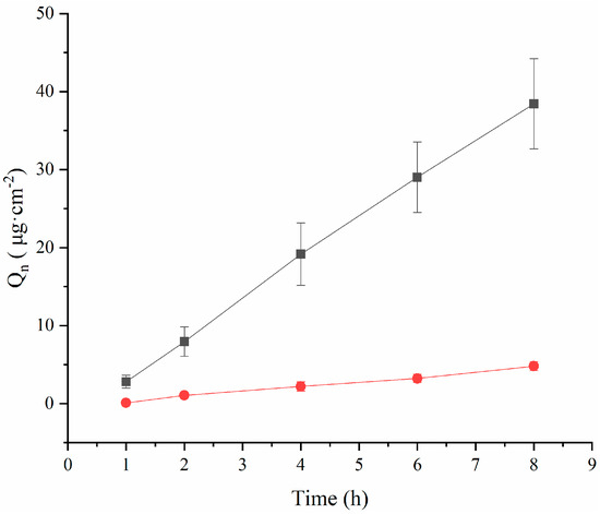 Cumulative permeate volume (Qn, µg·cm−2); apparent permeability coefficient (Papp, cm·s−1); and steady-state flow rate (Jss, µg·s−1·cm−2) were assayed using the following equations: