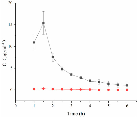 where Cn is the drug concentration at time t (μg·mL−1); Ci is the drug concentration at the last sampling time point t (μg·mL−1); C0 is the total amount of drug in the solution (μg·mL−1); and V is the volume of the sample obtained (2 mL).