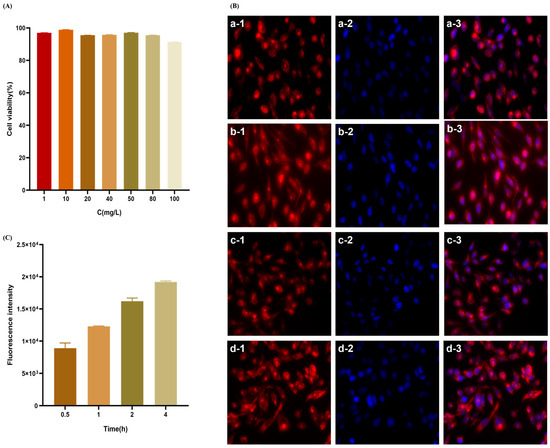 The cell survival rate was evaluated using the CCK8 method at concentrations ranging from 1 to 100 μg·mL−1 to investigate the transport of the nanodelivery system across the ocular barrier. The results are depicted in Figure 5A. The survival rate of HCE-T cells in (2-HP-β-CD)/PLGA nanoparticles exceeded 90%, establishing that the nanodelivery system was non-toxic to HCE-T cells at this concentration range.