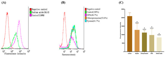 The main nanoparticle entry processes involve the clathrin structure, caveolin/lipid raft structure, and macropinocytosis [22]. The experiment was conducted by separately adding different endocytosis transport inhibitors to examine the degree of action during nanoparticle uptake. The clathrin structural inhibitor Chlorpromazine (30 μM), the caveolin/lipid raft structure inhibitor Nystain (30 μM), and the macropinocytosis inhibitor derivative amiloride (EIPA, 100 μM) were added seperately. Briefly, the cells were inoculated in six-well plates at a density of 1 × 105 cells·well−1. The culture medium was discarded when the cell density reached approximately 80%. Serum-free cultures of varying endocytotic transport inhibitors were inspected using the method described above (Study of Active Transport Mechanism in Nanoparticle Uptake by HCE-T Cells).