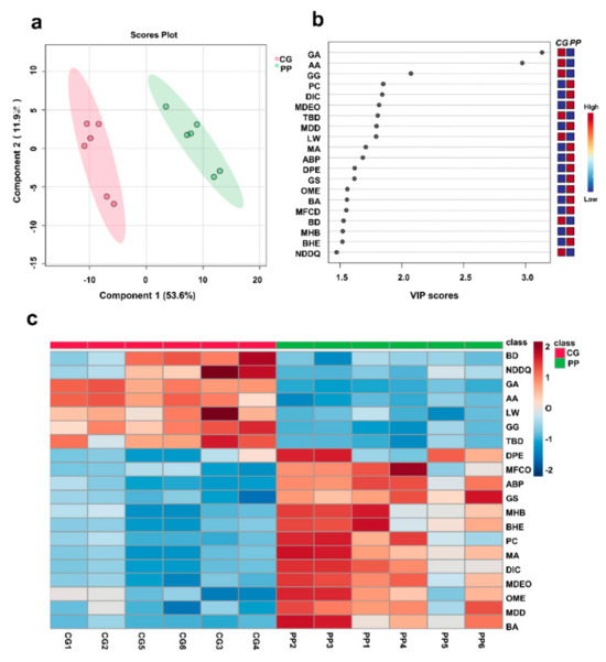 Scores plot (a) and VIP scores (b) of PLS-DA for ellagic acid extracted from gallnut and pomegranate peel, and (c) a heatmap of the top 20 compounds with VIP ≥1.5. Abbreviations: CG, gallnut; PP, pomegranate peel; GA, ginkgoic acid; AA, anacardic acid; GG, ginkgol; PC, 2-pentadecanone; DIC, 3,5-dimethyl-N′-[4-(trifluoromethyl) benzoyl]isoxazole-4-carbohydrazide; MDEO, Methyl 7,12-diacetoxy-3-ethoxycholan-24-oate; TBD, 5,5′,7,7′-tetrahydroxy-2,2′-bis(4-hydroxyphenyl)-4H,4′H-[8,8′-bichromene]-4,4′-dione; LW, LW8000000; MDD, 8-(4-Ethyl-1-piperazinyl)-3-methyl-7-(3-methylbutyl)-3,7-dihydro-1H-purine-2,6-dione; MA, medicagenic acid; ABP, 1-(1-Azepanyl)-3-{(3S,4R)-1-benzyl-4-[4-(2-methoxyphenyl)-1-piperazinyl]-3-piperidinyl}-1-propanone; DPE, 2,3-dinor Prostaglandin E1; GS, Glycol stearate; OME, 5-O-methyl embelin; BA, Butyldiglycol acetate; MFCD, MFCD00083370; BD, 2,1,3-Benzoxadiazole-4,7-dicarbonitrile; MHB, 4-Methoxyphenyl 4-((6-hydroxyhexyl) oxy)benzoate; BHE, (3beta,9xi)-3-(beta-D-Glucopyranosyloxy)-14-hydroxycard-20(22)-enolide; NDDQ, 7-Nitro-2,3-dioxo-2,3-dihydro-6-quinoxalinecarbonitrile.