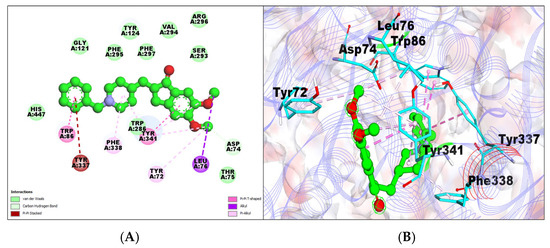The BChE–donepezil interaction showed a −7.67 kcal/mol binding affinity with a 2.39 μM inhibition constant and formed a total of four hydrogen bonds. The amino acid residue ER198, PHE398, PHE329, GLY116, THR120, TYR128, MET437, ASP70, TYR332, GLY117, and VAL288 were involved in the van der Waals interactions. LEU286, TRP82, andTYR440 built pi–alkyl bonds, while T-Shaped/Pi–Pi stacks were formed by TRP82 and TRP231 (Table 1; Figure 3A,B).
